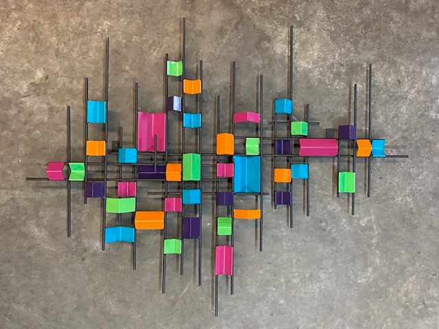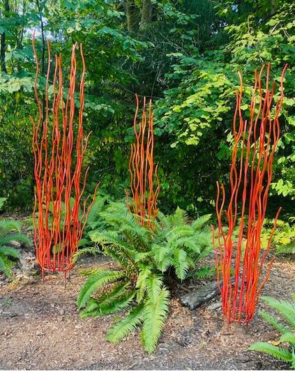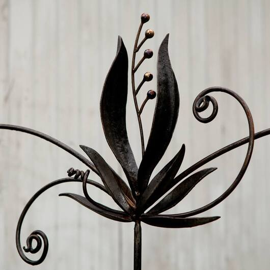 I have been working with metal for 25 yrs, bringing my background in pastel painting, textile print design and graphic design into sculptural form. My inspiration is “rooted” in nature. Seedpods, insect bodies, color, texture, design and even scents all transport me into an imaginary world. It’s very exciting to forge cold hard steel into fluid organic shapes; bringing my ideas to fruition. My garden sculptures are of ficticious plant species that often ingage your imagination! All are intended for outdoor, year round enjoyment.